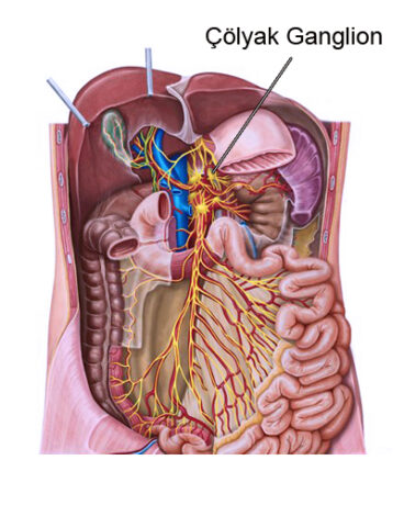 Midenin altında çölyak arterinin yakınında, ancak diyaframın önünde uzanan bir sinir demeti vardır. Bu çölyak sinir demeti, bir ila beş büyük çölyak gangliyonu içerebilir. Bu sinirler ağrı duyusunu karından omuriliğe ve beyne iletir ve böylece harabiyete uğradıklarında geçici olarak işlevleri bozulur ve hasta ağrı hissetmez.